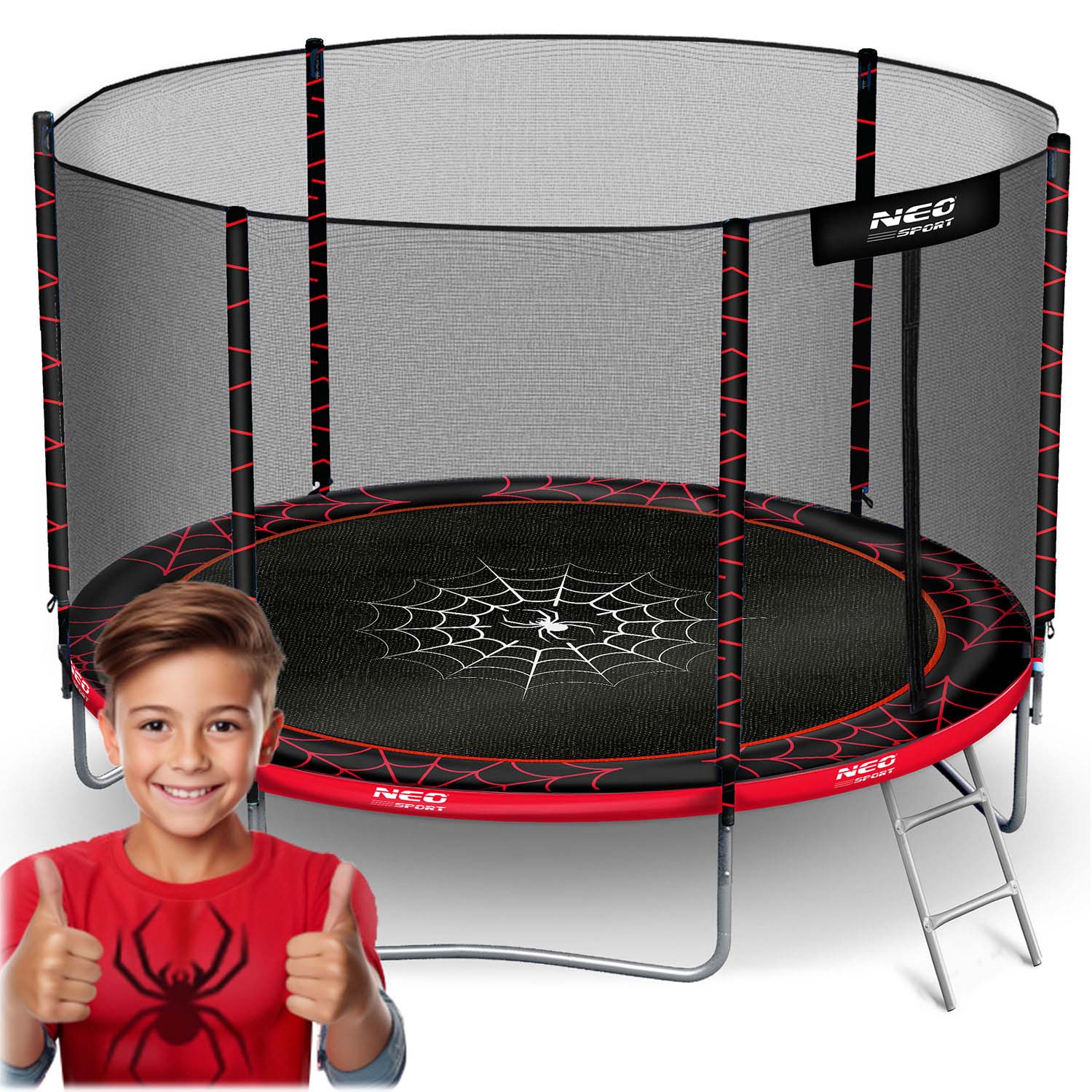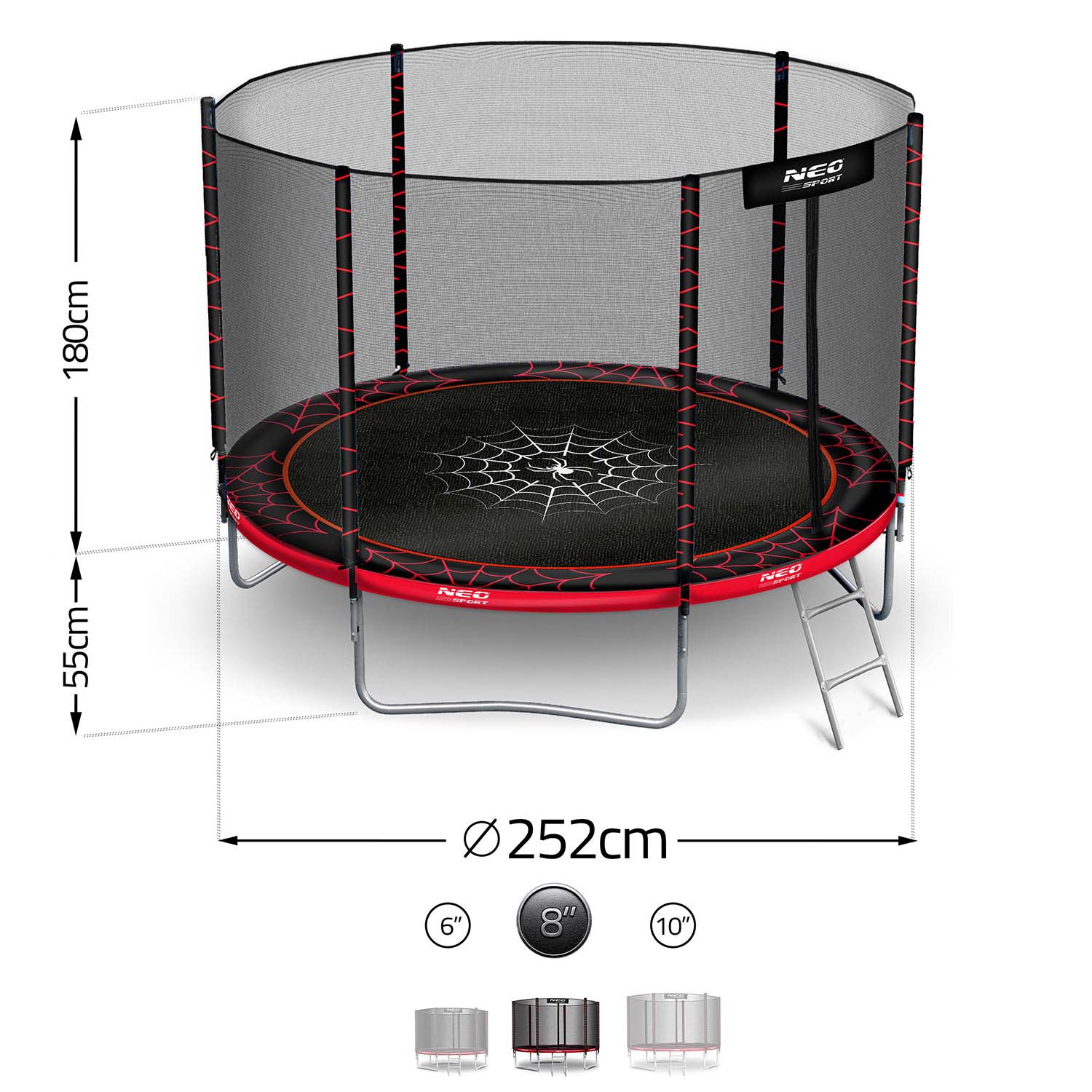Trampolina NEO SPORT o imponującej średnicy 252 cm zapewnia mnóstwo miejsca do skakania – idealna dla dzieci i dorosłych!