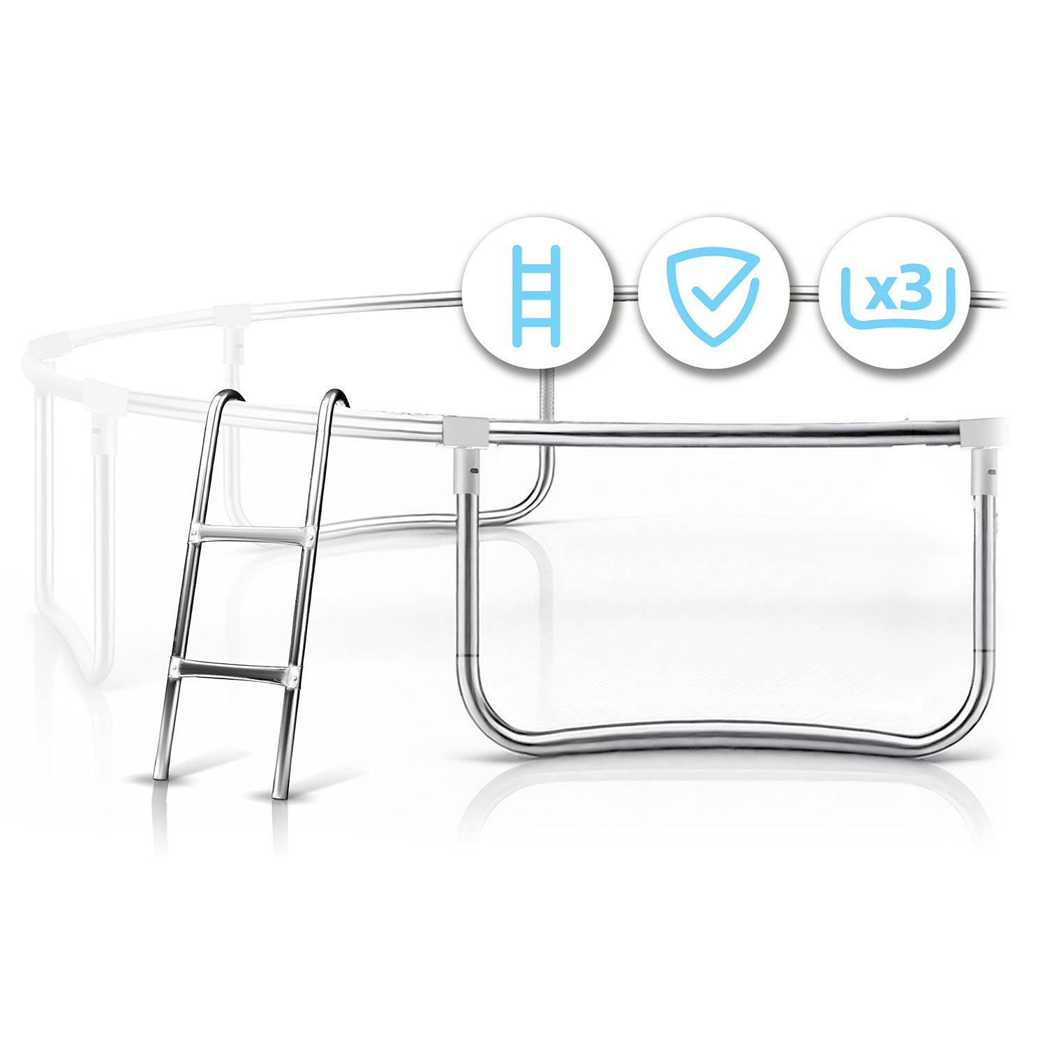 ✅ Drabinka z mocowaniem – solidna, metalowa i odpowiednio nachylona. Ułatwia bezpieczne wchodzenie i schodzenie, szczególnie dzieciom. Dzięki przemyślanemu kątowi nachylenia zapewnia wygodny dostęp do trampoliny.