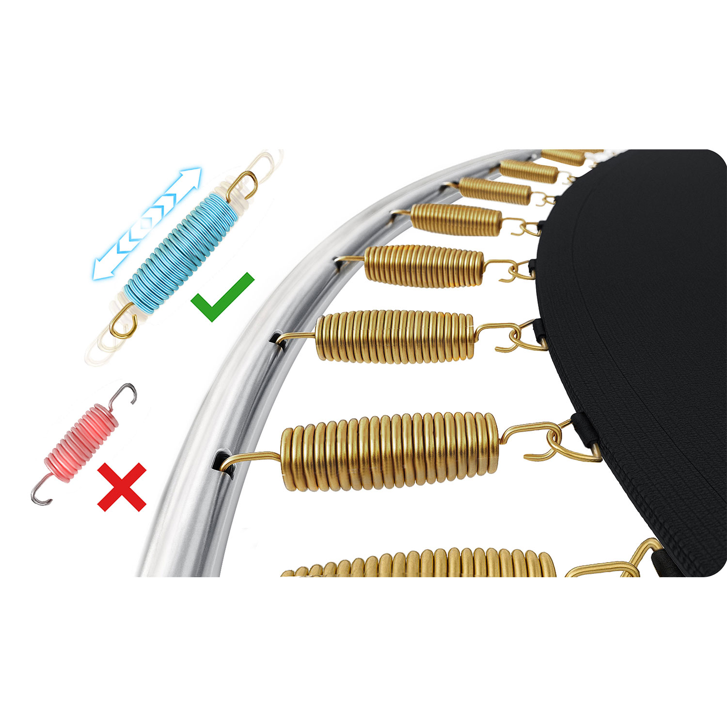 Zastosowaliśmy wydłużone i mocno naprężone sprężyny o zwiększonej elastyczności – dla jeszcze lepszego odbicia i komfortu skakania.
