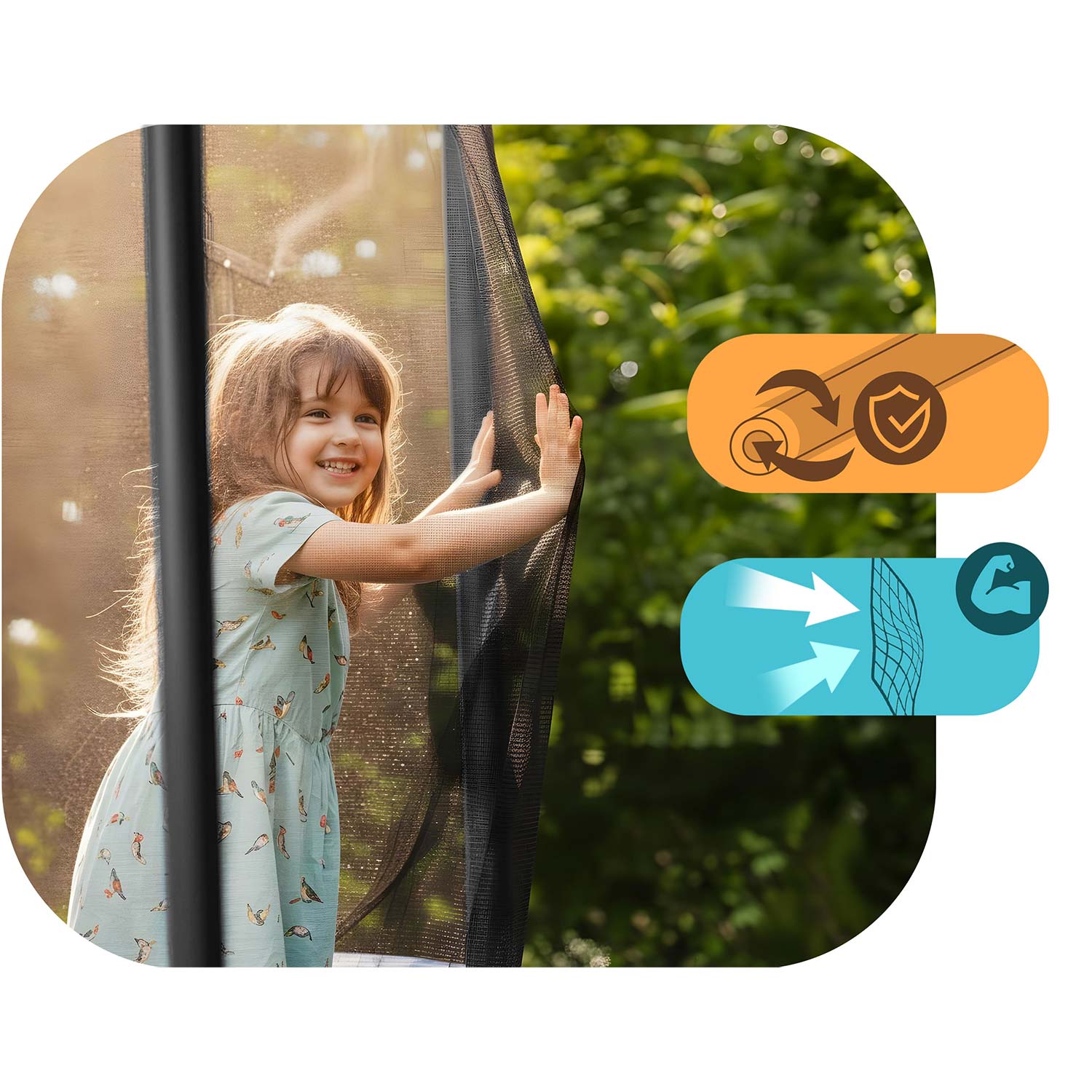 Bezpieczeństwo – wyjątkowo wytrzymała siatka chroni przed wypadnięciem, zapewniając długotrwałą ochronę.
