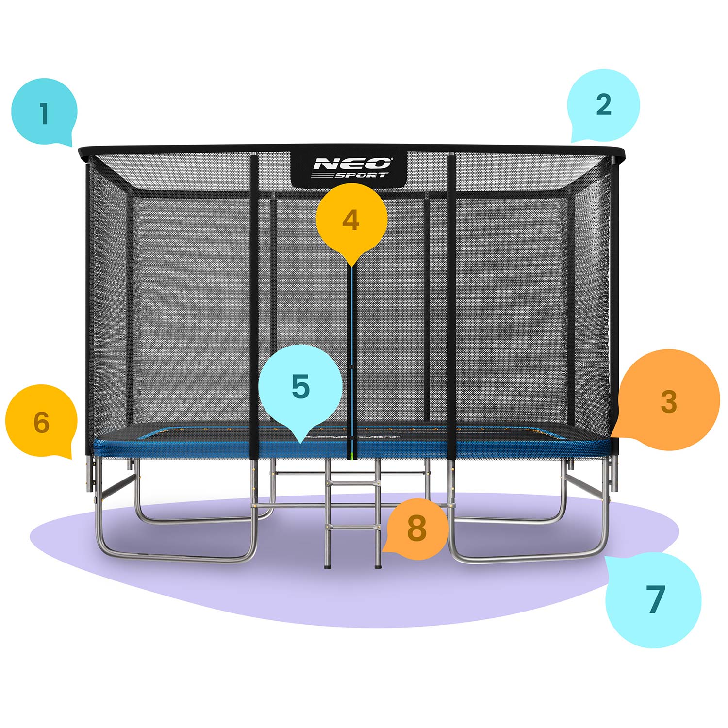 Stelaż trampoliny NEO-SPORT został wykonany z wysokiej jakości stalowych rurek ocynkowanych, odpornych na korozję, promieniowanie UV i intensywne użytkowanie.